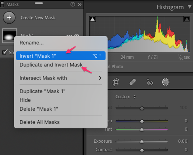 With the new Invert Composite Mask feature, just right-click on a mask itself or use either the Invert Mask, which inverts the whole mask or the Duplicate and Invert Mask to create a new inverted mask , with all the sliders on the original mask cleared.